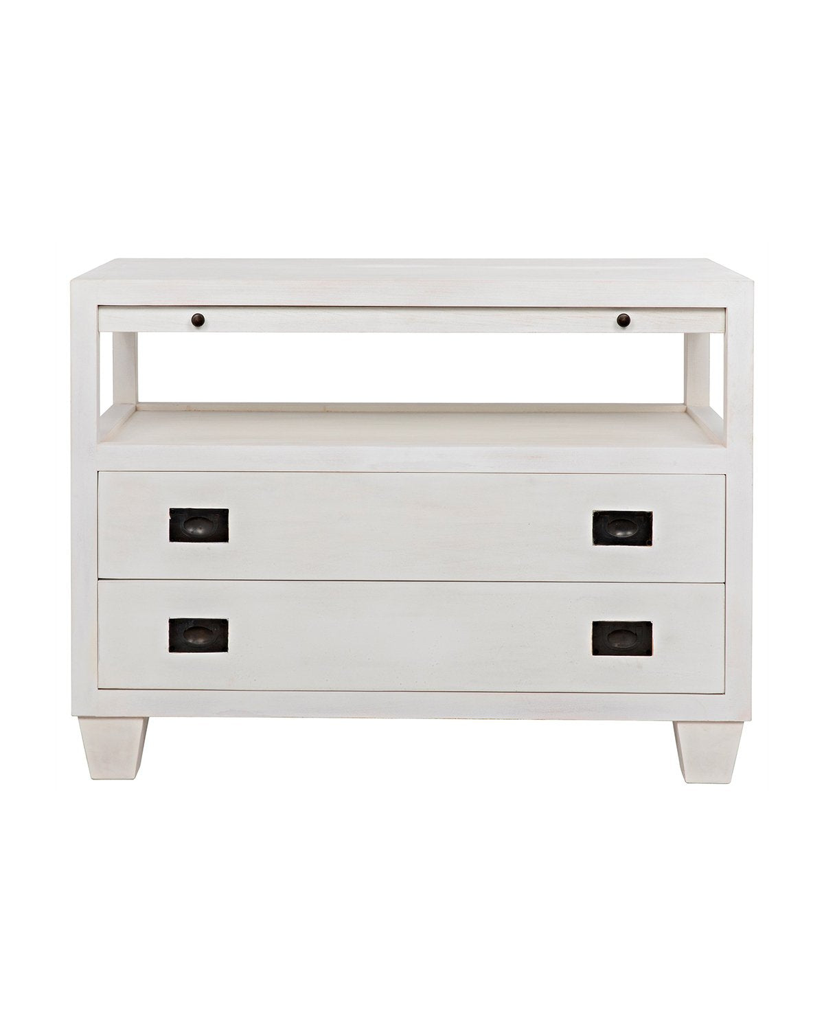 Not only beautiful to look at, this dresser’s wide drawers and an open-air shelf carry serious storage and display space. Its top-sliding tray, however, make its design particularly unique and functional.